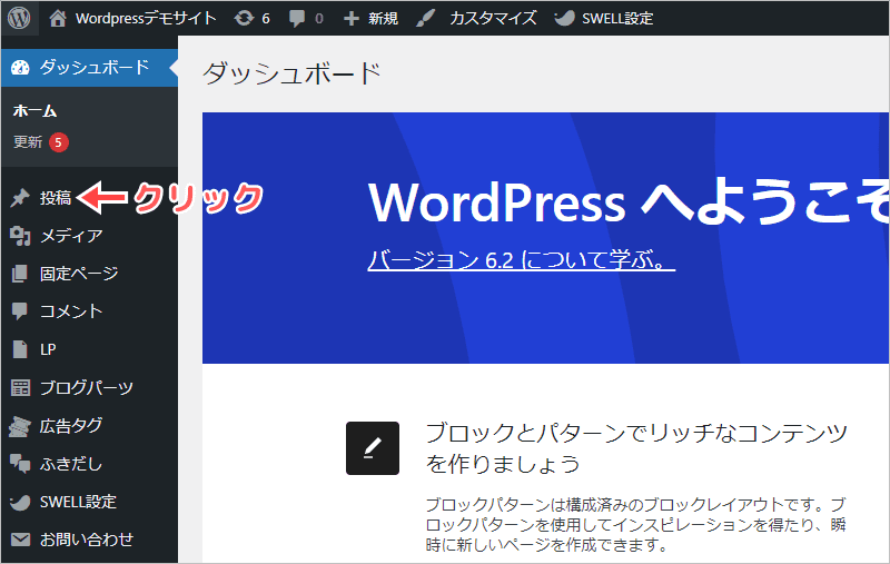 管理画面の左側にある「投稿」をクリックします。