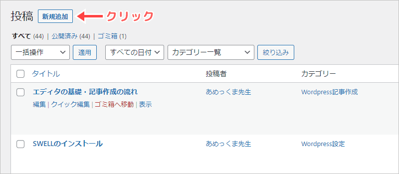 記事を作成する場合は、上の方にある「新規追加」をクリックしましょう。