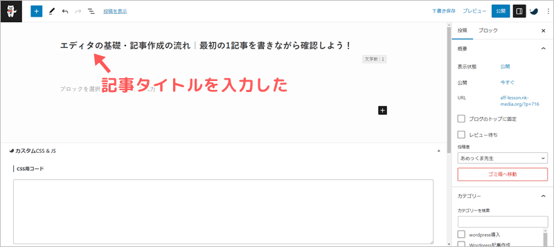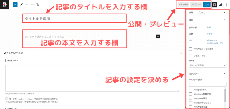 まずは1記事目を書きながら、この4か所の使い方に慣れましょう。