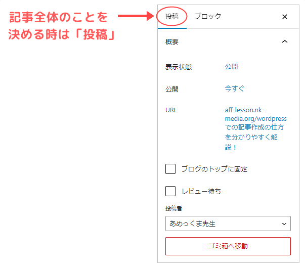 記事全体の設定を行う場合は、「投稿」タブを使います