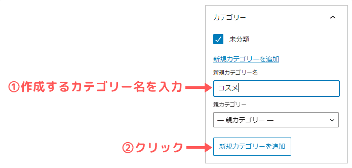 👇のように、①「新規カテゴリー名」を入力して・②「新規カテゴリーを追加」をクリックしましょう。