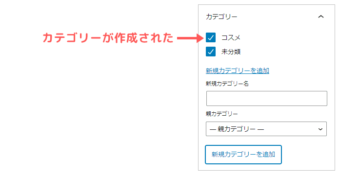 この時「未分類」と「新しいカテゴリー」の複数が選択された状態になるので、必ずカテゴリーは1つだけが選択されている状態にします