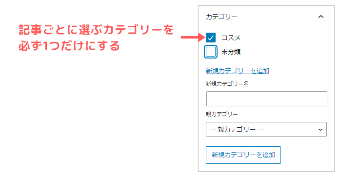1記事が所属できるカテゴリーは1つのみが原則です。複数カテゴリーを選ばないように注意しましょう。
