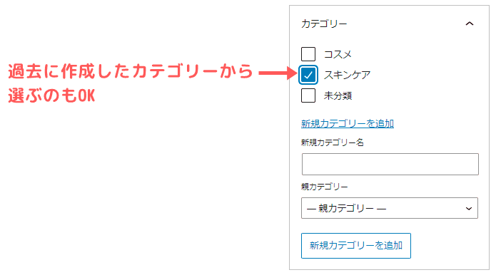 記事を作るたびにカテゴリーを新規作成するのではなく、過去に作ったカテゴリーから選ぶのもOKです。