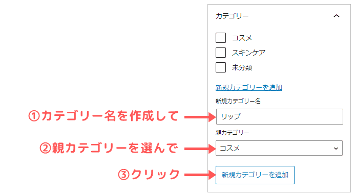 👇にように、①「新規カテゴリー名」で新しく作成して・②「親カテゴリー」から親を選び・③「新規カテゴリーを追加」をクリックして下さい。