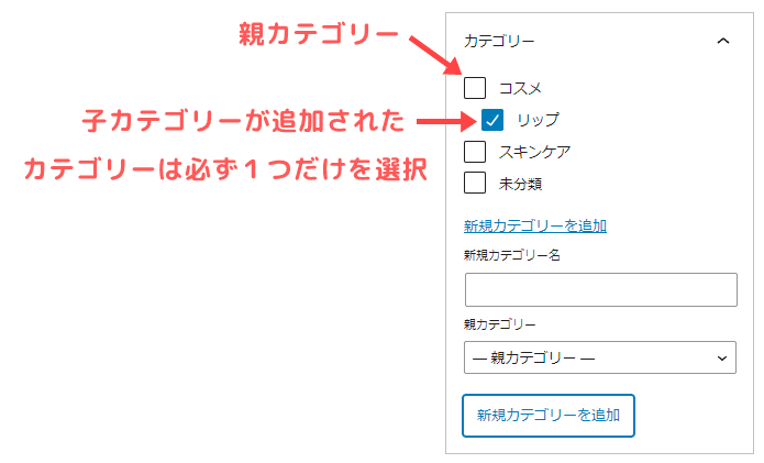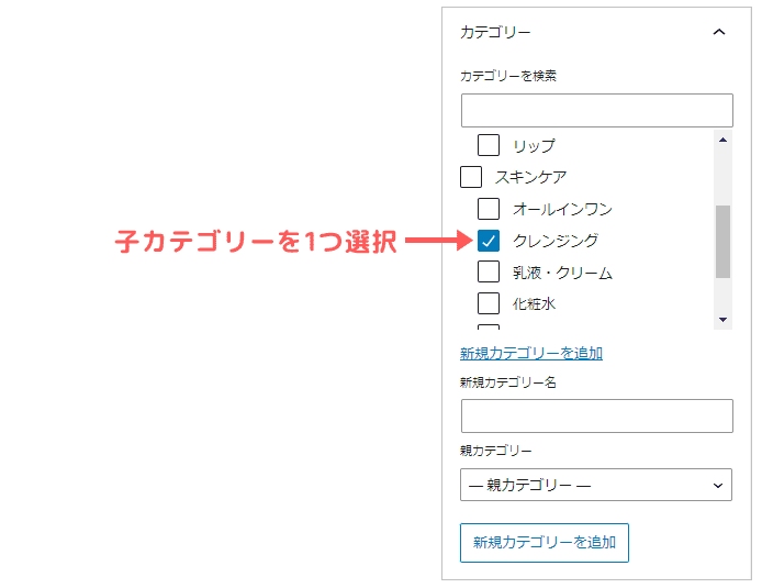この時も、子カテゴリー1つのみが選択されている状態にしましょう。(親と子の両方を選択しないように!)