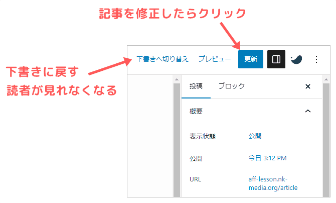 公開中の記事を修正したら「更新」をクリック、公開状態を中止し下書き状態に戻す場合は「下書きへ切り替え」をクリックしましょう。