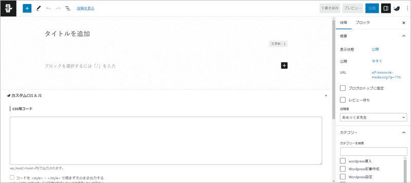 ちなみに、今回は最初の作成なのでデフォルトの「未分類」カテゴリーしか表示されていませんでした。