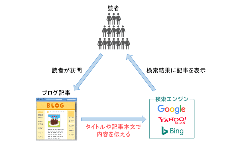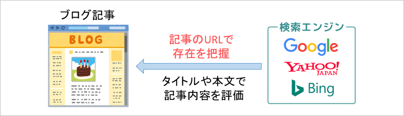 検索エンジンは記事URLでその存在を把握し、タイトルや本文で記事内容を評価します