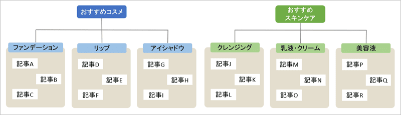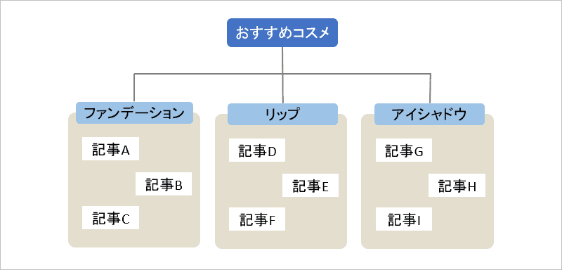 例えば、美容系のブログを作成した場合に親カテゴリーを「コスメ」にして、子カテゴリーを「ファンデーション」「リップ」「アイシャドウ」のように分類します。