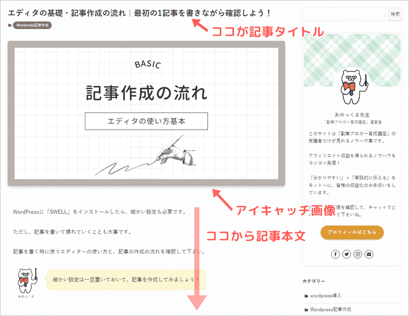 作成した記事は、👇にように「記事タイトル」「アイキャッチ画像」「記事本文」の流れで表示されます。