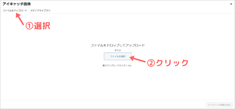 ①「ファイルをアップロード」のタブを選んで、②「ファイルを選択」をクリックします。
