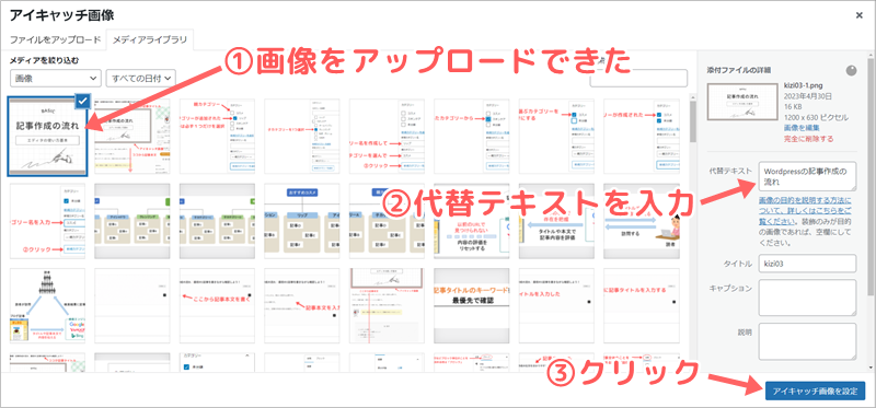 👇にように①選んだ画像がアップロードされるので、②右側の代替テキストの欄に入力して、③右下の「アイキャッチ画像を設定」をクリックします。
