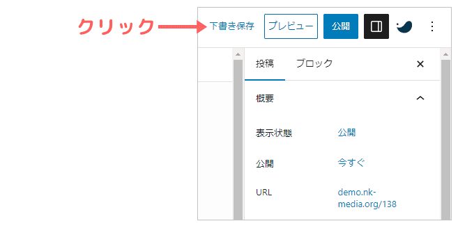 👇のように、エディタ右上の「下書き保存」をクリックすればOKです。