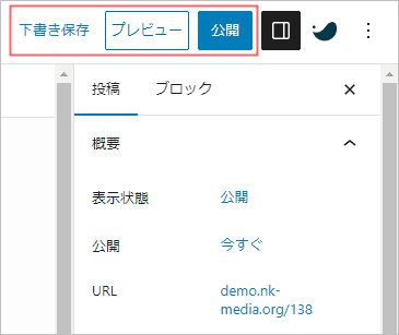 エディタ右上の部分では、「下書き保存」「プレビュー」「公開」の設定を行います。