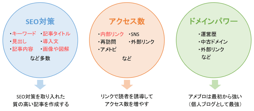 検索上位を狙いたい記事のアクセス数を内部リンクで増やすことが重要です。