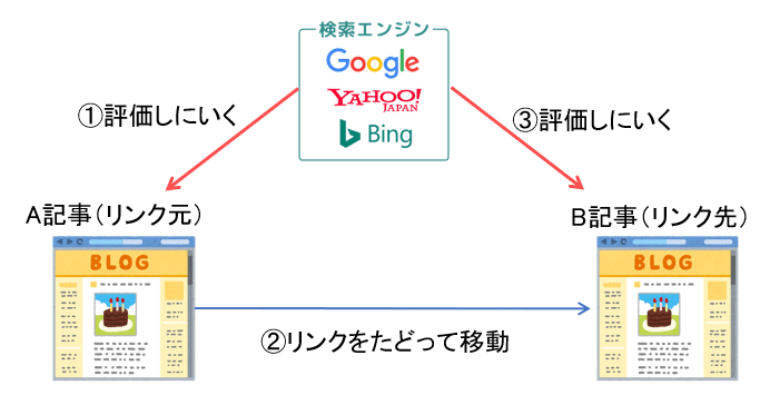 自分のブログ内のA記事(リンク元)からB記事(リンク先)へ内部リンクを貼ったとしましょう。