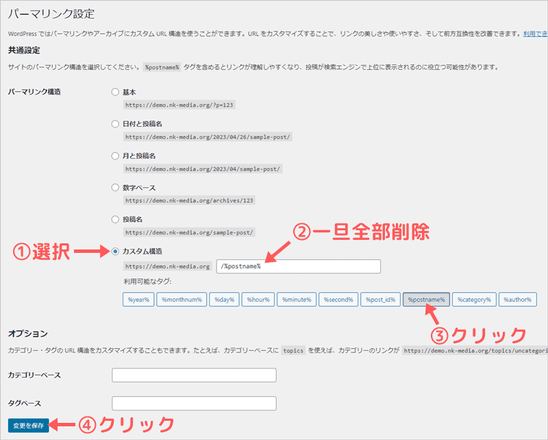 👇のように、①「カスタム構造」にチェックを入れ・②中身を一旦削除して・③「%postname%」をクリックして下さい。