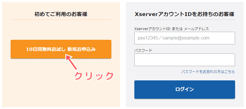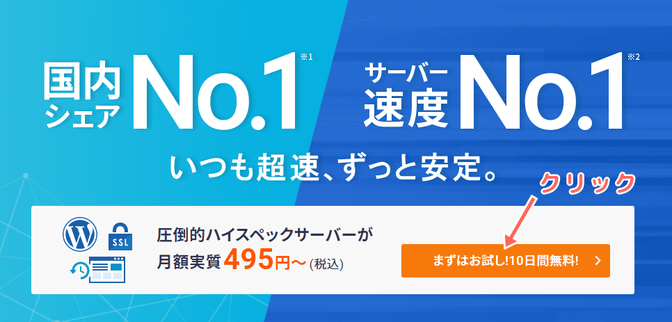 「まずはお試し!10日間無料!」のボタン部分をクリックして下さい。