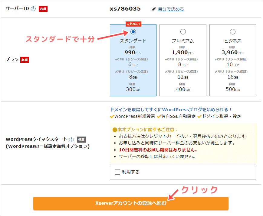 👇の画面に進むので、プランを「スタンダード」で選び、「Xserverアカウントの登録へ進む」をクリックしましょう。