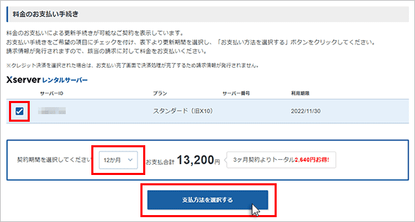 作成したアカウントの契約期間を選んで、「支払方法を選択する」をクリックして下さい。