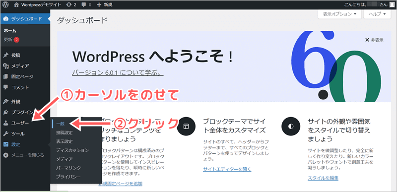 WordPress管理画面の左側にある「ユーザー」から、「一般」を選んで下さい。