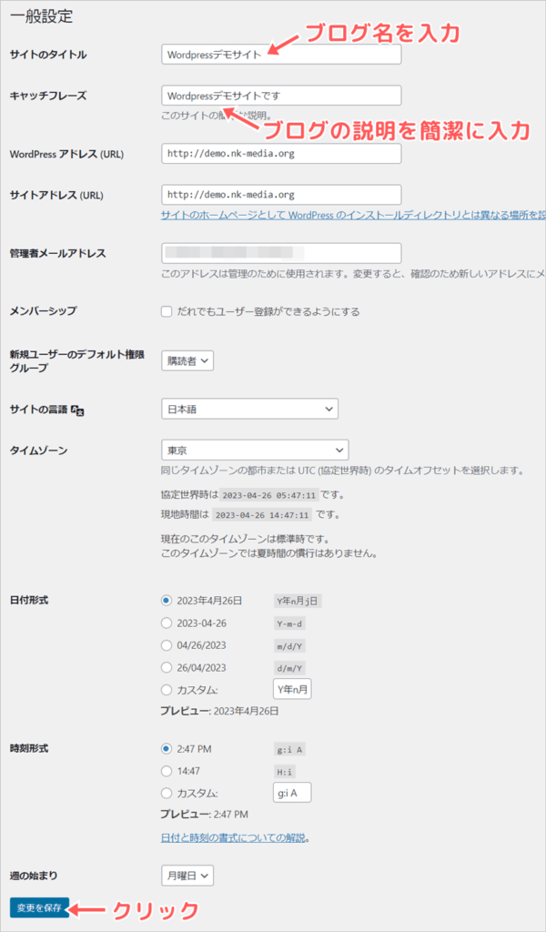 キャッチフレーズには初期状態で「Just another WordPress site」と入っているので、ブログ内容の簡単な解説を短文で入れて下さい。