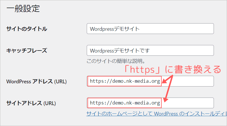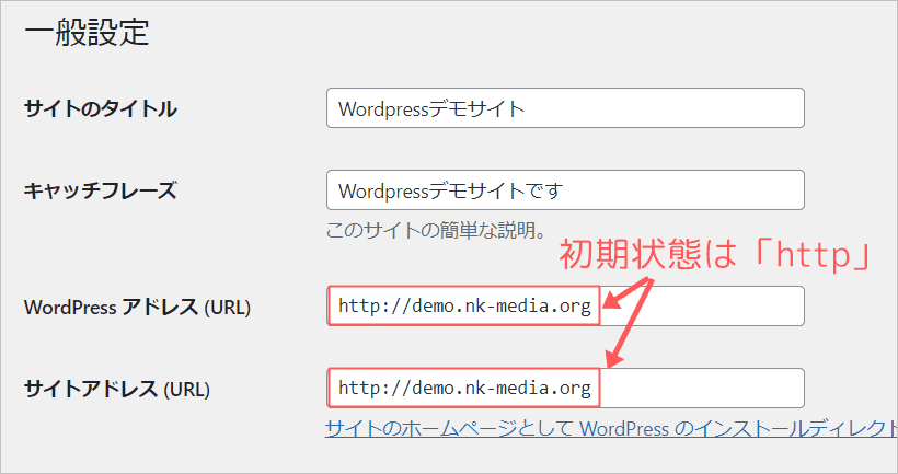 一般設定を開くと、初期状態ではURL2か所は「http」になっています。