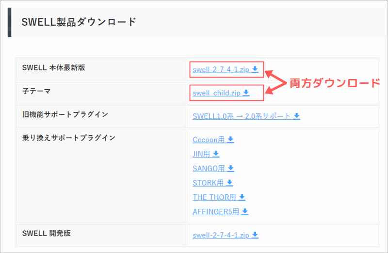SWELL本体最新版(親テーマ)と子テーマをそれぞれクリックして、ご自身のPCにダウンロードしましょう。