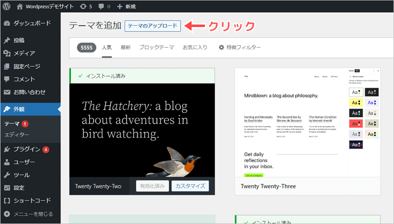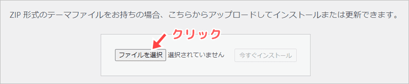 外部のテーマを使う場合は、上の方にある「テーマのアップロード」をクリックして下さい。