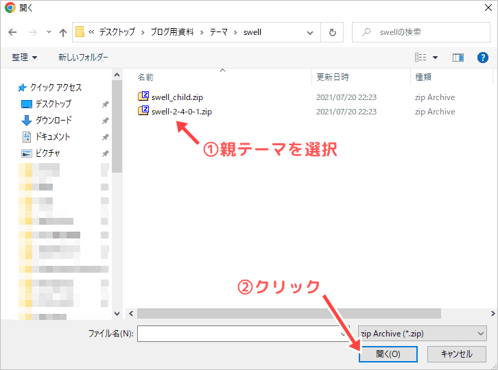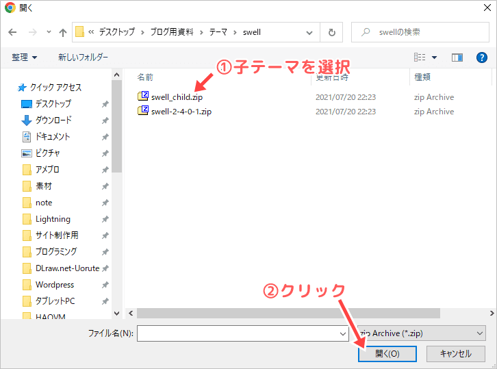 ご自身のPCのフォルダが開くので、「子テーマ」を選択します。