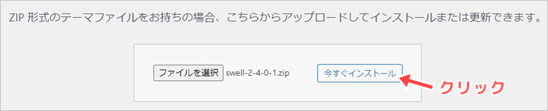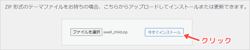 「子テーマ」をアップロードしたら、「今すぐインストール」をクリックします。