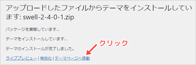 インストールが終了すると👇の画面になるので、「テーマページへ移動」をクリックします。