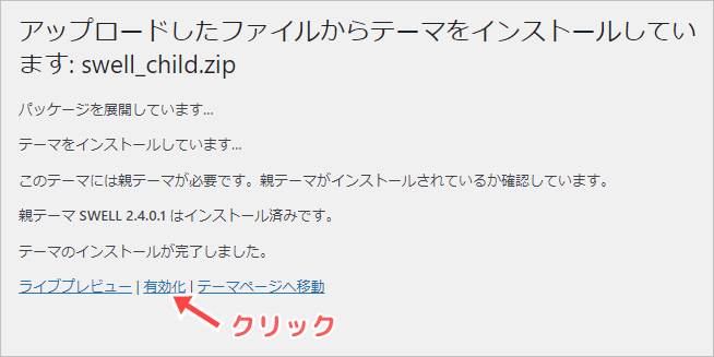 親テーマは有効化せず、インストールだけでOKです。有効化するのは、この後にインストールする子テーマとなります。(理由後述)