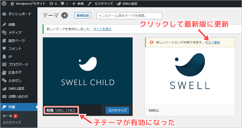 テーマの画面に切り替わり、👇のように「子テーマ」が有効化された状態となります。