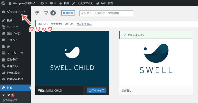 次に管理画面左側の「ダッシュボード」をクリックします。