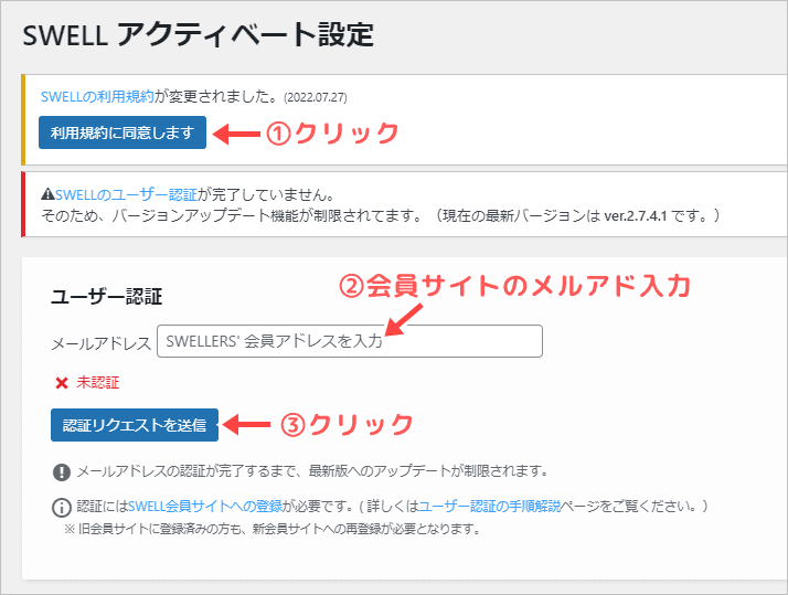 👇の画面に切り替わるので、①「利用規約に同意します」をクリック・②会員サイト「SWELLERS’」に登録したメールアドレスを入力・③「認証リクエストを送信」をクリックしましょう。